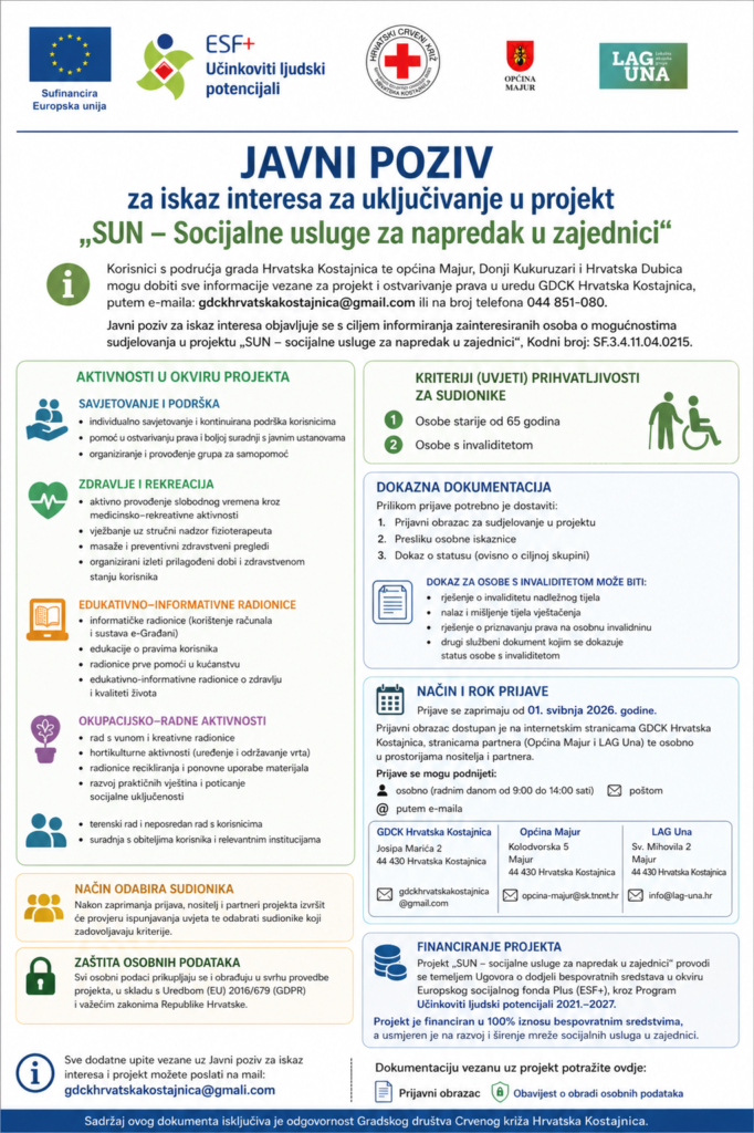 Pozivaju se odrasle osobe s invaliditetom, starije osobe i članovi obitelji/udomiteljskih obitelji ciljnih skupina s područja grada Hrvatska Kostajnica te općina Majur, Donji Kukuruzari i Hrvatska Dubica da se uključe u aktivnosti projekta „SUN – Socijalne usluge za napredak u zajednici“.